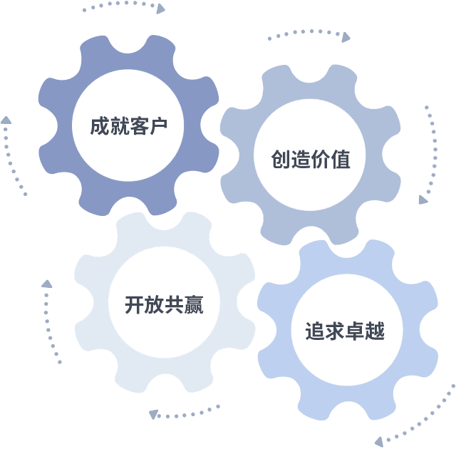 成就客户是一切决策的出发点,,创造价值是衡量所有工作的标准,,追求卓越是我们做事做人的态度,,,,开放共赢是我们的格局也是最终的结果。。。价值观的齿轮环环相扣,,,推动着组织里的每个人不断向前。。