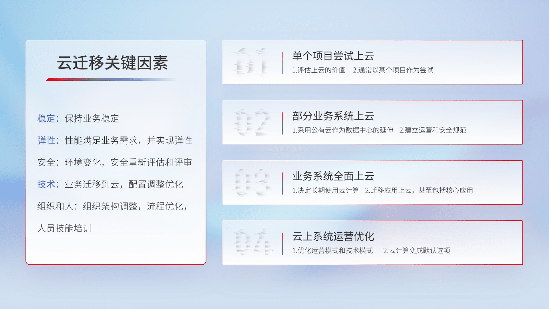 结合实际业务,,,从规划设计、、、云平台选型、、、、云原生改造、、、数据迁移、、、、集成交付,,迁移全过程为客户识别最佳上云路径,,做好风险识别管理,,,,设计网络架构、、、身份权限、、、、安全审计合规、、、操作审计、、、、日志审计、、监控告警策略、、多站点容灾设计等,,,对云上基础设施进行整体规划,,,,提升IT治理水平,,,,以满足弹性、、、、高可用、、、、高性能的需求。。。
